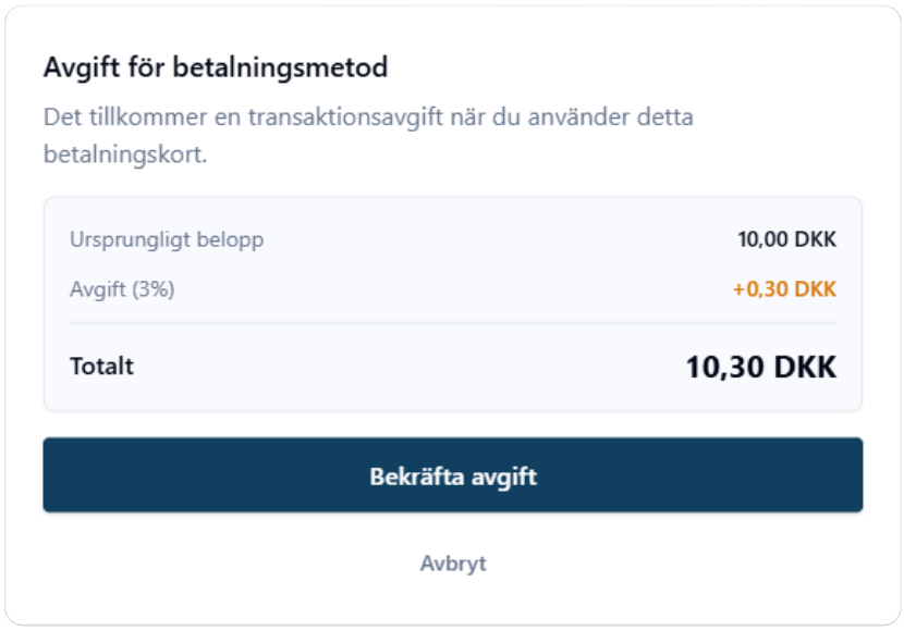 För att lösa detta har vi utvecklat ett extra godkännandesteg i betalningsflödet. När en avgiftsregel är aktiverad kommer kunden - efter det första godkännandet - att bli ombedd att bekräfta betalningen en gång till om en avgift har lagts på. Först därefter genomförs transaktionen.