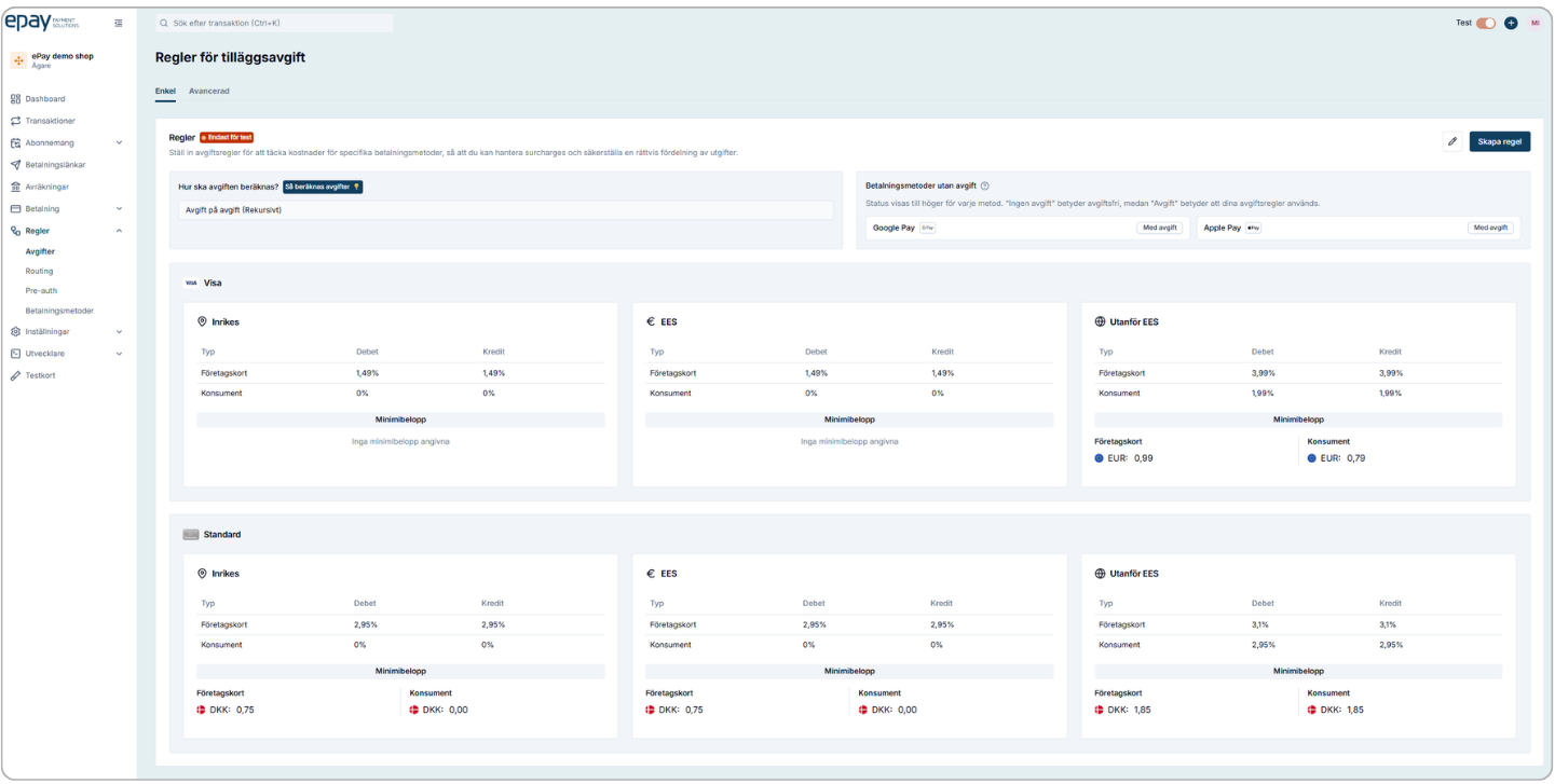 Via vårt backoffice kan du enkelt konfigurera avgiftsregler för Apple Pay och Google Pay.
